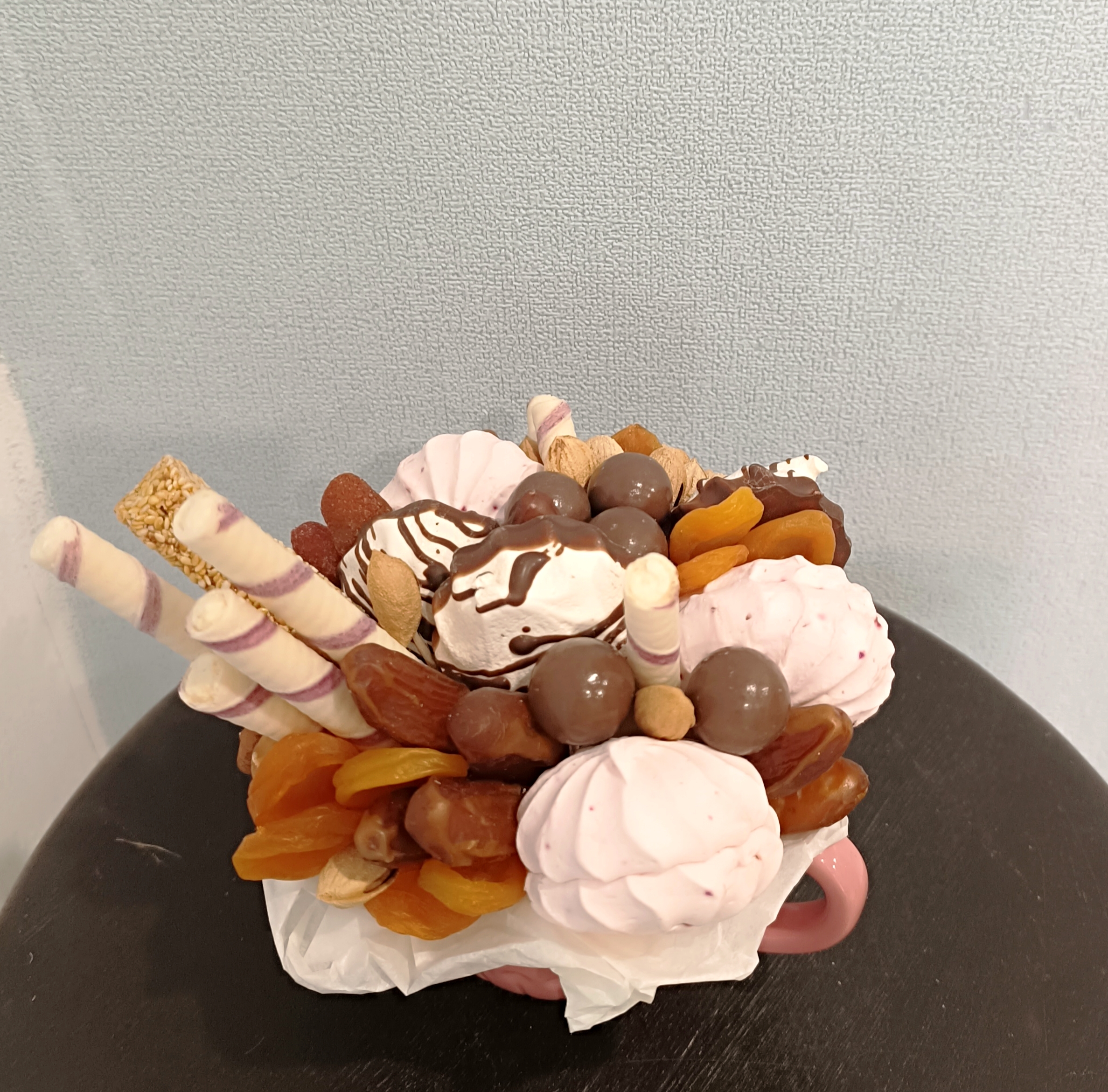 Милый комплимент и подарок по поводу и просто так с заботой о получателе, можно подарить любимым, родным, друзьям и коллегам. В составе: кружка керамика или фаянс, зефир 2 вида, шоколадные конфеты, молочные трубочки, орехи, сухофрукты.