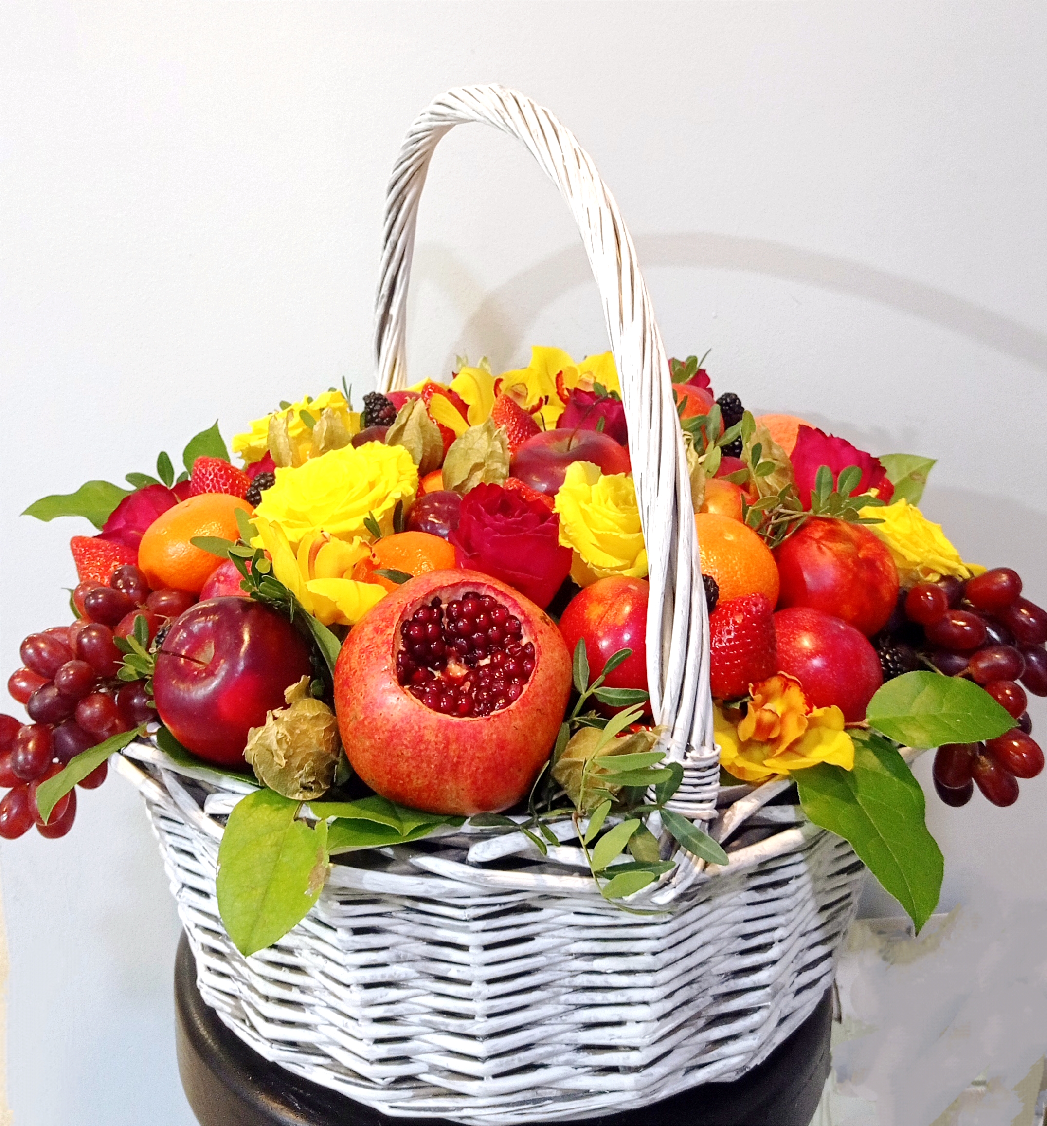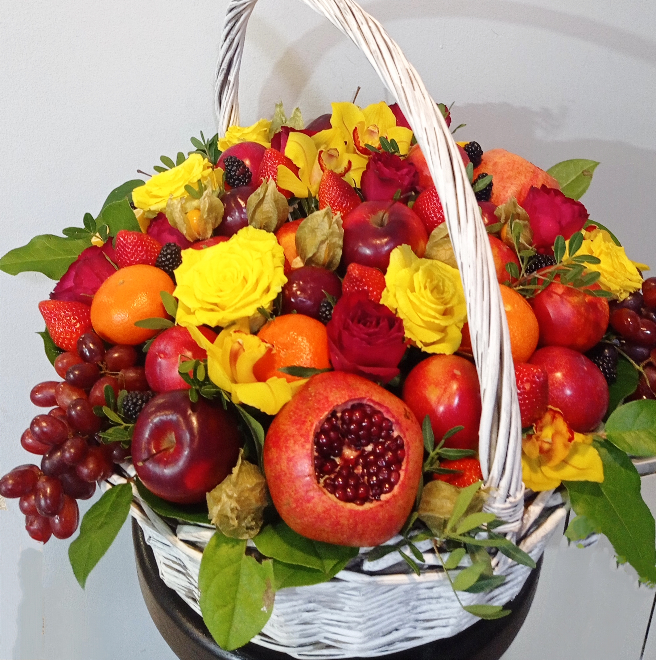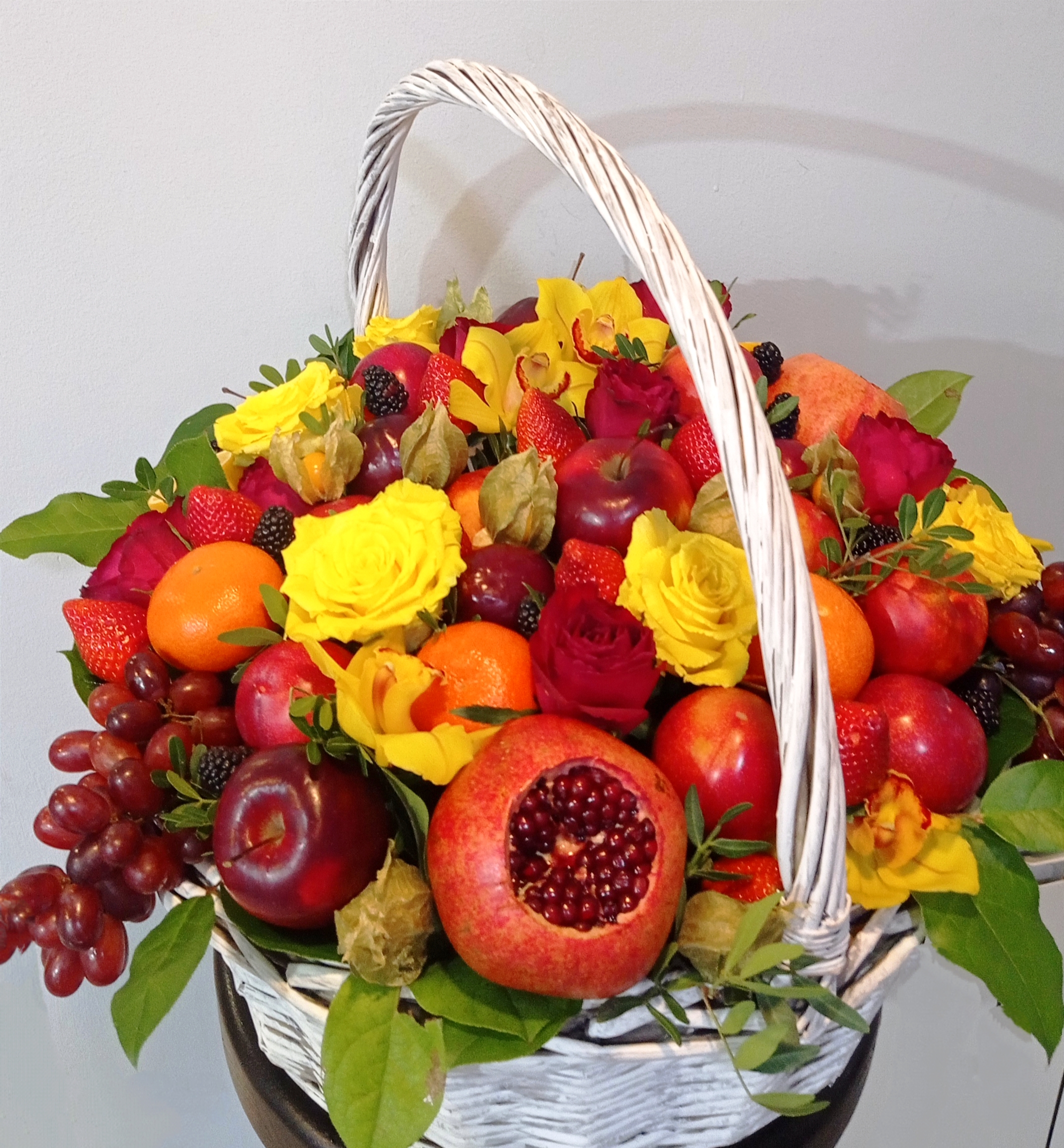 Большая корзина с фруктами, розами и орхидеями